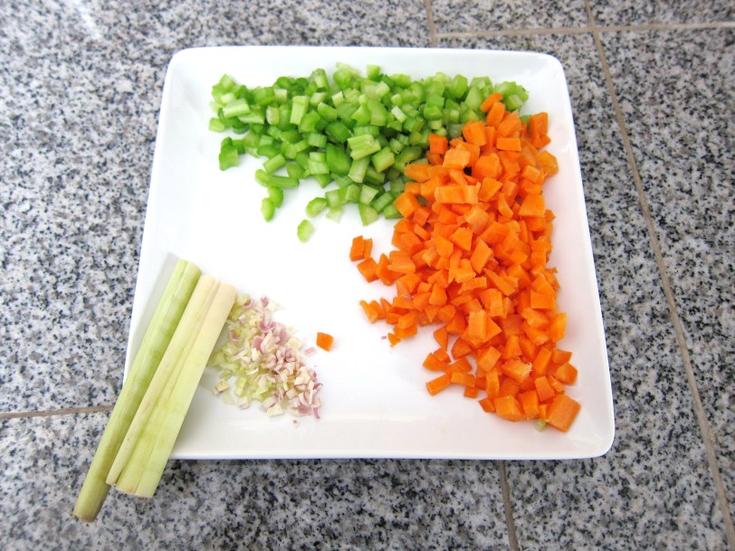 In the morning or afternoon, season the short ribs with salt and pepper, sear on both sides then pop them into the slow cooker (aka the crock pot). With the back of a knife, whack (or “bruise”) one stalk of lemongrass and toss it in with the meat. With the other stalk, peel off the woody outside and mince the tender white/purplish inside (something I only recently learned you could do). Saute the shallot, celery, carrot, garlic, minced lemongrass and jalapeno until brown and tender. Add tomato paste, deglaze the pan with red wine (cheap, but still good enough to drink with dinner). Save 3 TB for the curry sauce. Dump everything into the crock pot. Add enough organic beef stock to cover the meat then let the whole thing simmer on medium through the day.