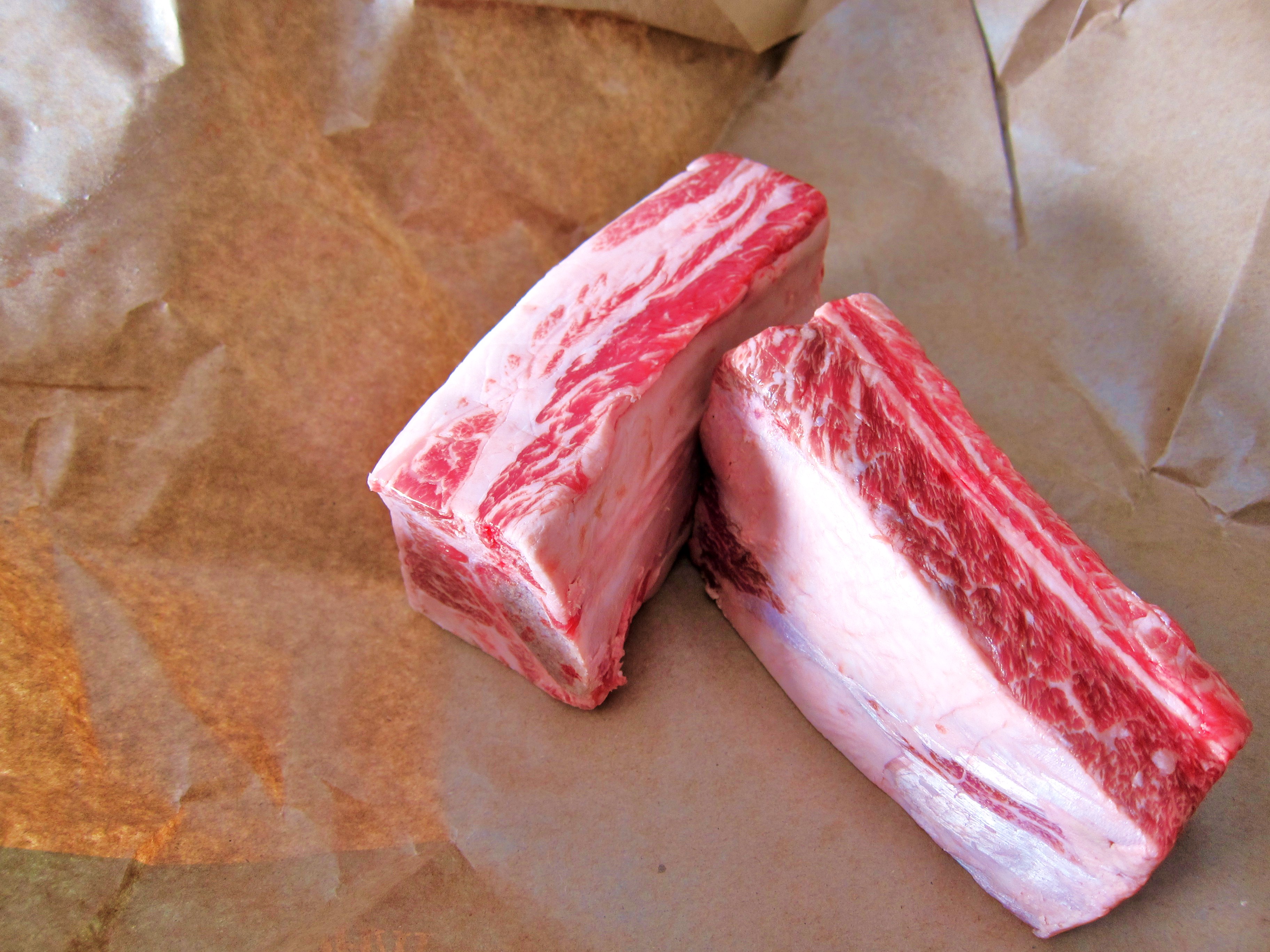 K has a fondness for bacon, but does not have a fondness for my substitutions. He reluctantly agrees to them most of the time because I’m cute and convincing. This week, however, he wanted real short ribs. The co-op doesn’t carry them right now so he made a special trip, over his lunch hour, to Whole Foods. The recipe calls for 35 lbs of short ribs and, seeing as there are two of us, we went with 2 lbs instead.