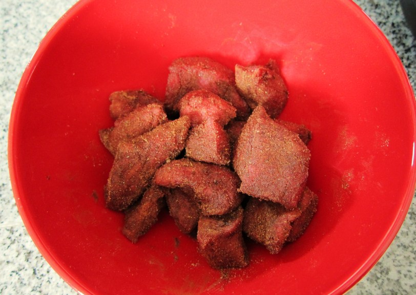 Save 1 TB spice mix. Set aside. Combine all dry spices (through ginger above, including salt and sugar) in a mixing bowl. Coat chunks of meat in spice blend. NOTE: If you have time, refrigerate for a few hours. If not, you’ll still have a great dinner.