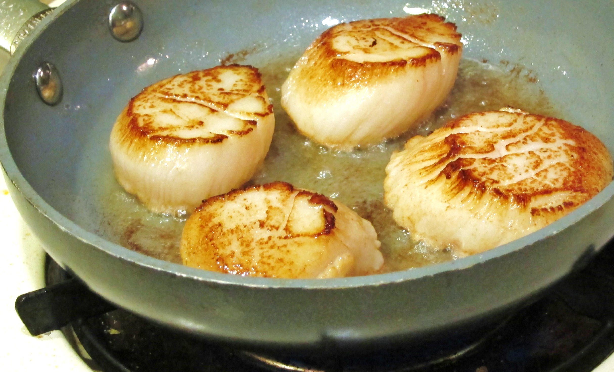 Pat scallops entirely dry on both sides with paper towel. Season with salt and freshly ground pepper. Coat bottom of saute pan with safflower or canola (high heat) oil and heat on medium-high. When oil is very hot, add scallops and cook until seared and brown (2-3 minutes). Flip and cook two minutes more.