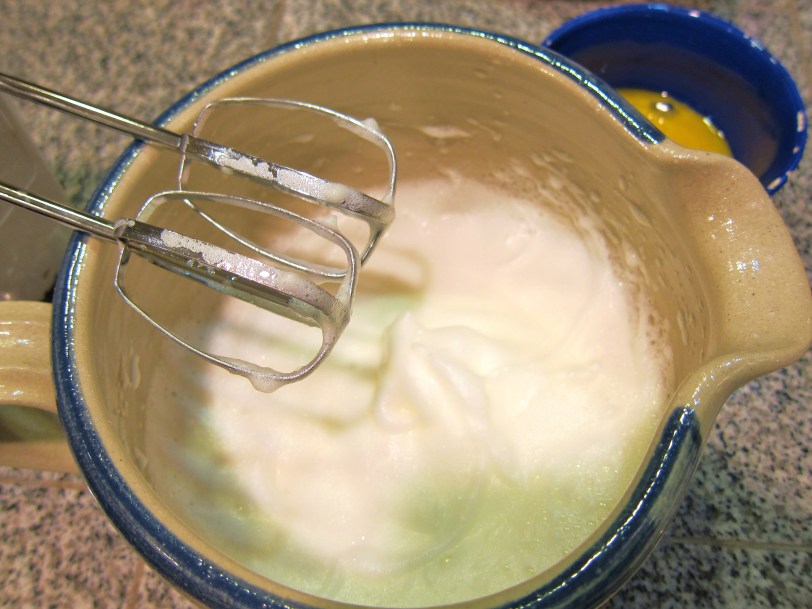 Separate the egg yolks and egg whites. Use a mixer to beat egg whites to soft peaks. Put flour into separate bowl. Add egg yolks, melted butter and sugar. Add the milk and whisk until batter is smooth. Fold egg whites into batter.