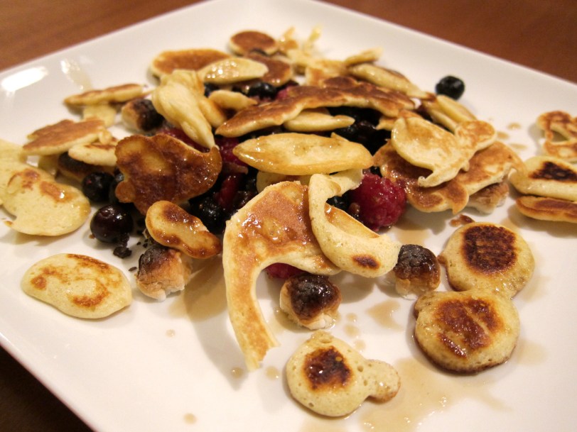 If you don’t love pancakes, there is something seriously wrong with you. A humble pancake can be sweet or savory, it can be plain or the vehicle for any number of embellishments — variety, thy name is pancake. But when chef Edward Lee reduced pancakes, not to the size of a dinner plate or even a silver dollar, but to pancake bits, we wondered why this wasn’t the gold standard of pancakes. After all, the best part of a pancake is the hot, crispy outer edge. And because everyone loves breakfast for dinner, we decided to shake up Top Chef night with pancake bits, bacon, blueberries, raspberries and bruleed marshmallow (click here for original recipe).