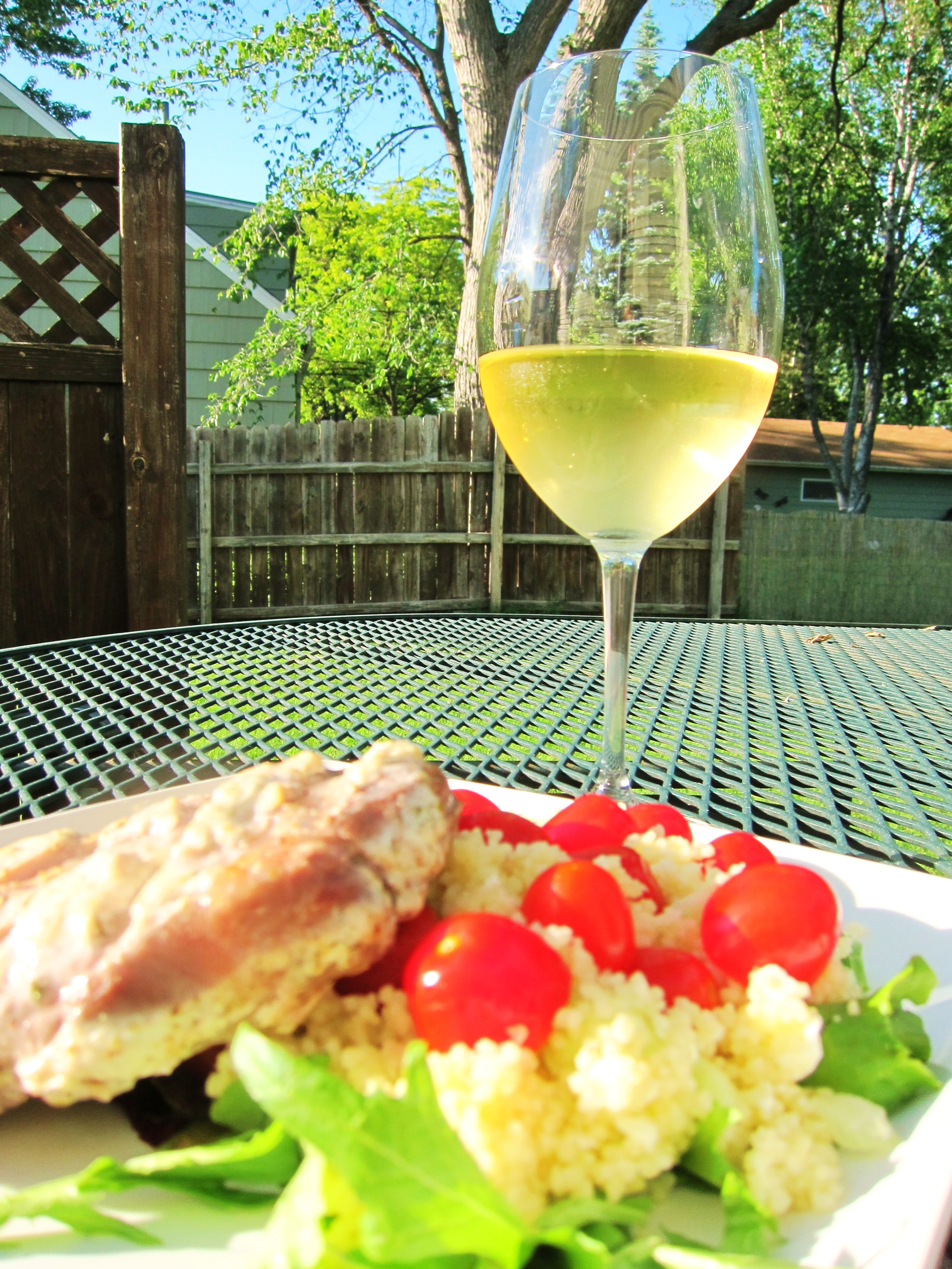 Into the toaster oven they went while we made a quick couscous salad — simple vinaigrette, greens, feta cheese, cucumbers, tomatoes for K (none for me, thanks, I don’t like raw tomatoes) and Kalamata olives for me (none for K, thanks, he doesn’t like olives). And a generous glass of Taburno Falanghina white wine. We sat on the deck and ate — the peaceful atmosphere pierced by our dogs barking at anyone walking/biking by and the occasional outburst of cheering from the nearby baseball fields. Sun-soaked and slowly, I went from “Code Dark Orange” (aka “hangry”) to just plain old grouchy, but nicely filled up with a quick and tasty dinner.