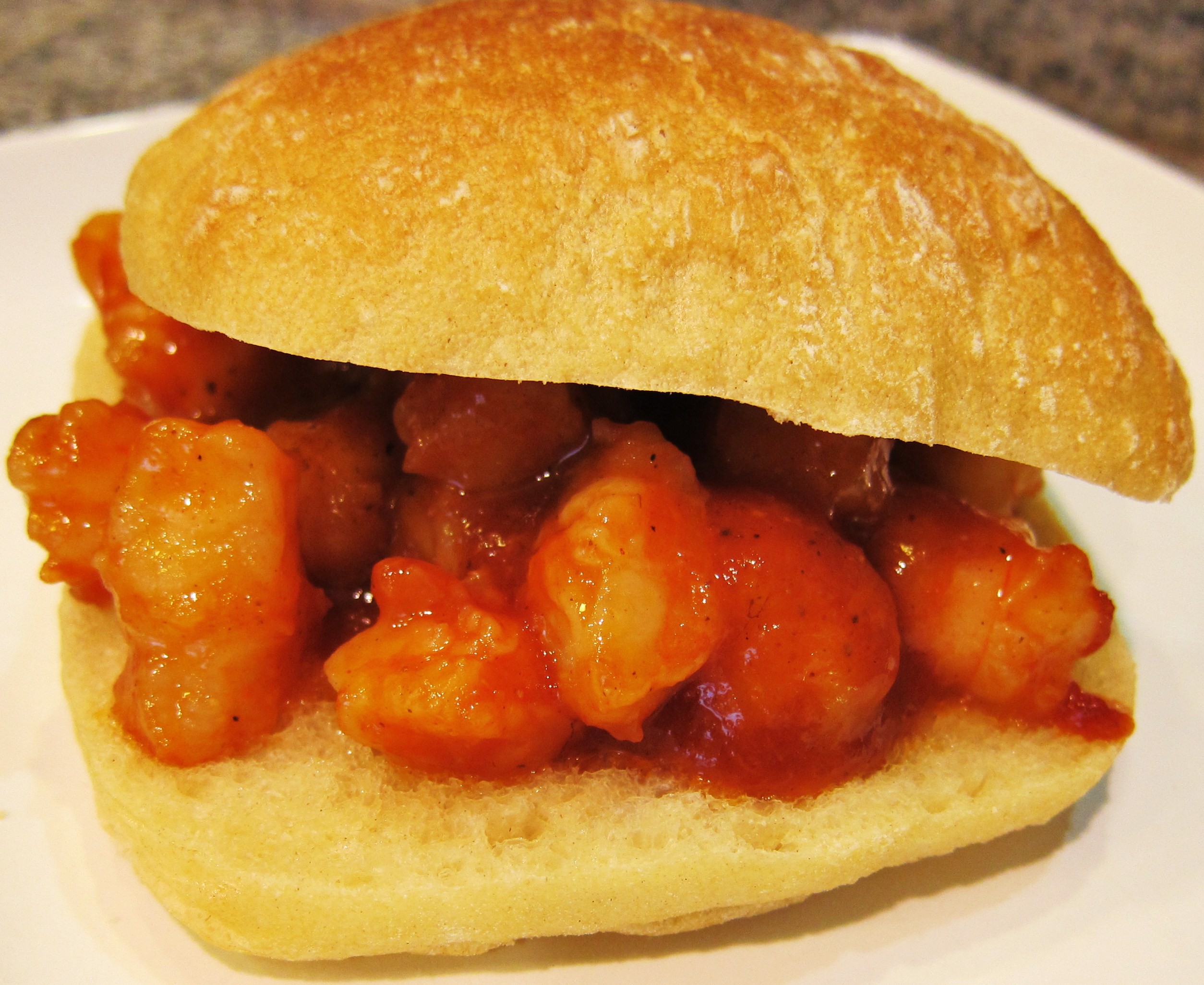 We’d just rolled in from our out-of-town road trip, K had a soccer game to get to and we were both tired from a long weekend of travel and events. We always keep a bag of raw shrimp in the freezer. We happen to have on hand a bottle of barbecue sauce homemade by my grandmother (who asked us to decide if it could be awarded “gourmet” status). We had two Ciabatta rolls. Clean and cut up the shrimp, saute briefly, add barbecue sauce, toast bun, assemble, eat.