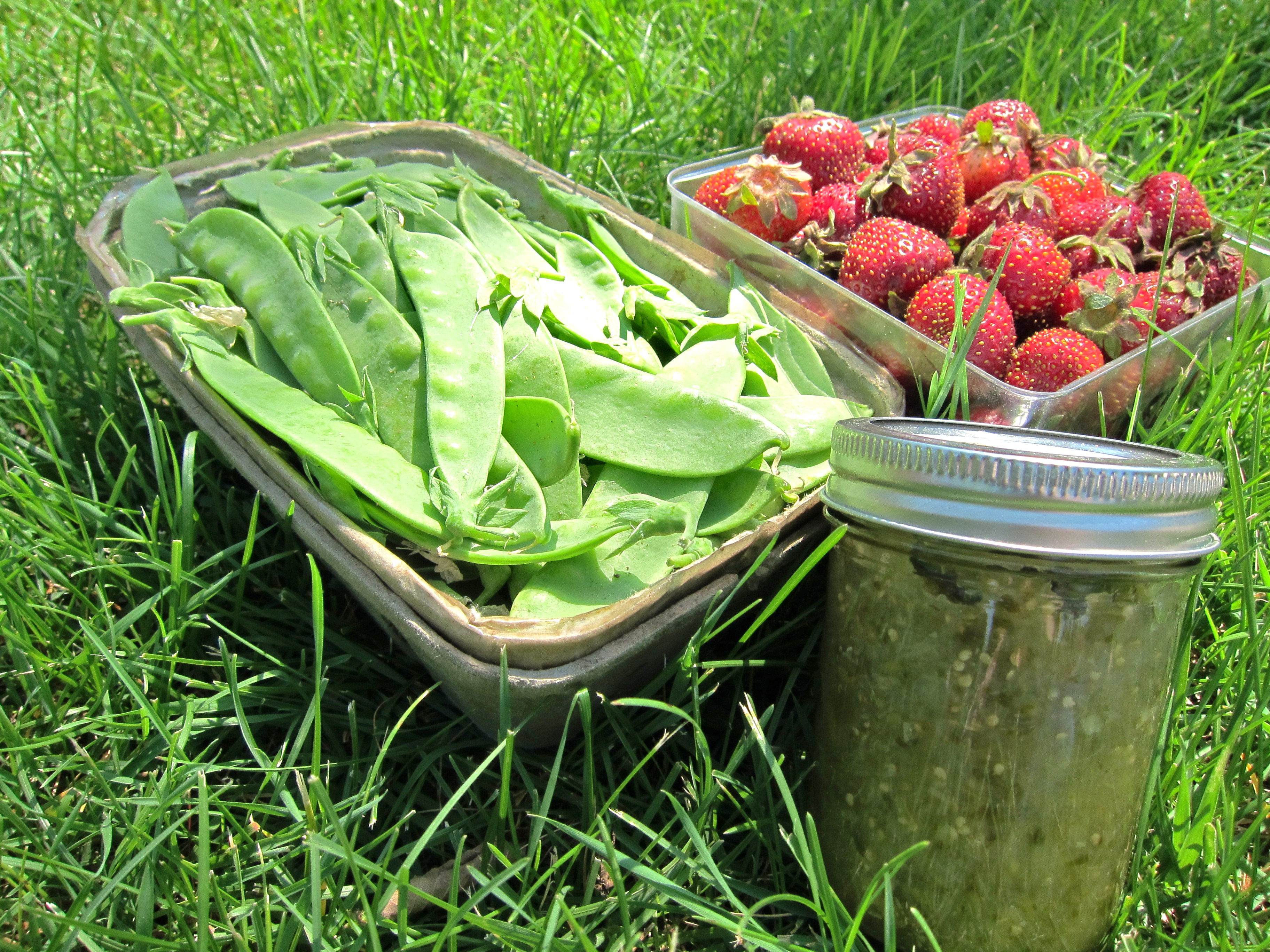 Snow pea pods, juicy strawberries, homemade salsa verde and (not pictured) a big package of bacon from a farm in central Minnesota where the pigs roam free. Assuming I don’t just snack on them all until they’re gone (a distinct possibility), what to do with our wealth of strawberries and snow peas … suggestions are welcome!