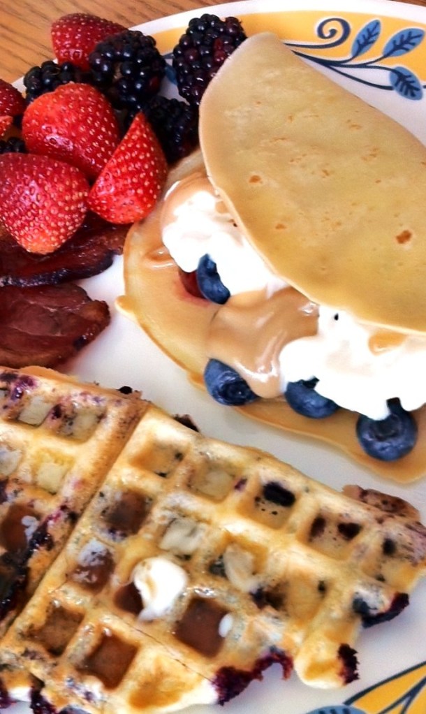 Last week was my dad’s birthday. Besides mowing and tending to his lawn (seriously — we’re pretty sure the lawn is his third child), his favorite pastime is to hang out with his family (even better if it’s during a Minnesota Twins baseball game). So I dusted off our neglected waffle maker and we had a waffle bar brunch. My mom likes crepes so she added those to the mix. The grandkids (our niece and nephews) got to choose the fruit they wanted in or on their waffles and stuffed their crepes full of fruit, brown sugar caramel and whipped cream. The bacon from the farmers market was quickly devoured. Mini banana cream pies (my dad’s favorite) were enjoyed and the munchkins all “helped” Grandpa blow out the candle in his mini pie. Then an afternoon of playing on the Slip n’Slide in the hot summer sun happened.