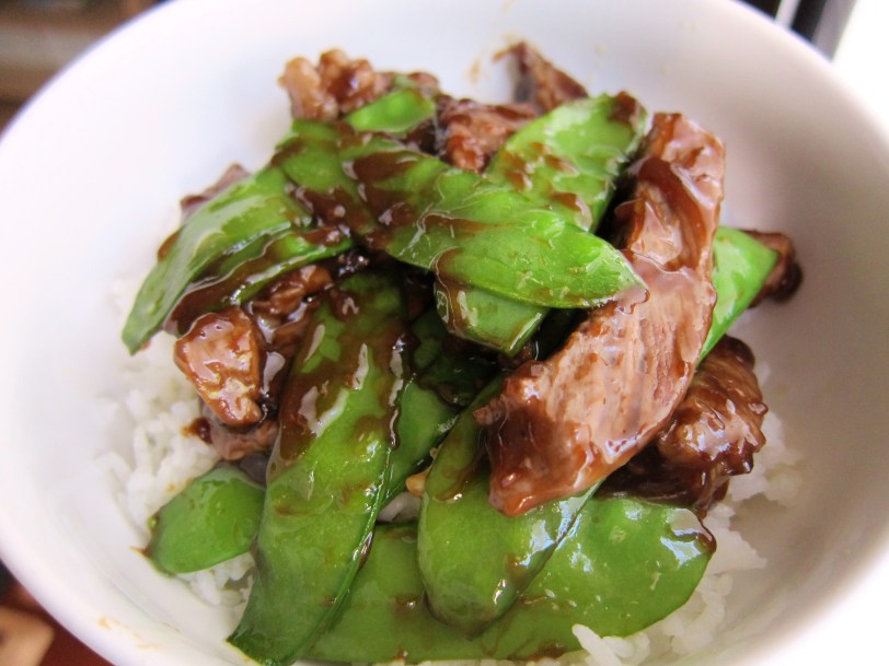 Throw some jasmine rice in the rice cooker. Saute the pea pods with a little sesame oil in a wok. Make a simple sauce with five ingredients — soy sauce, oyster sauce, cornstarch, ginger and brown sugar. Thinly slice some flank steak (or similar cut of beef — if you’ve got something thicker, flatten it with a mallet). Toss the beef into the wok. Wait until it’s *just about* done (three, maybe four minutes), throw in the sauce and the peas. Stir to coat. Serve on top of the rice. Boom. Dinner.