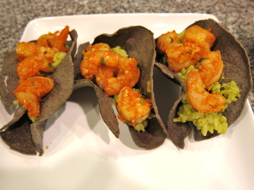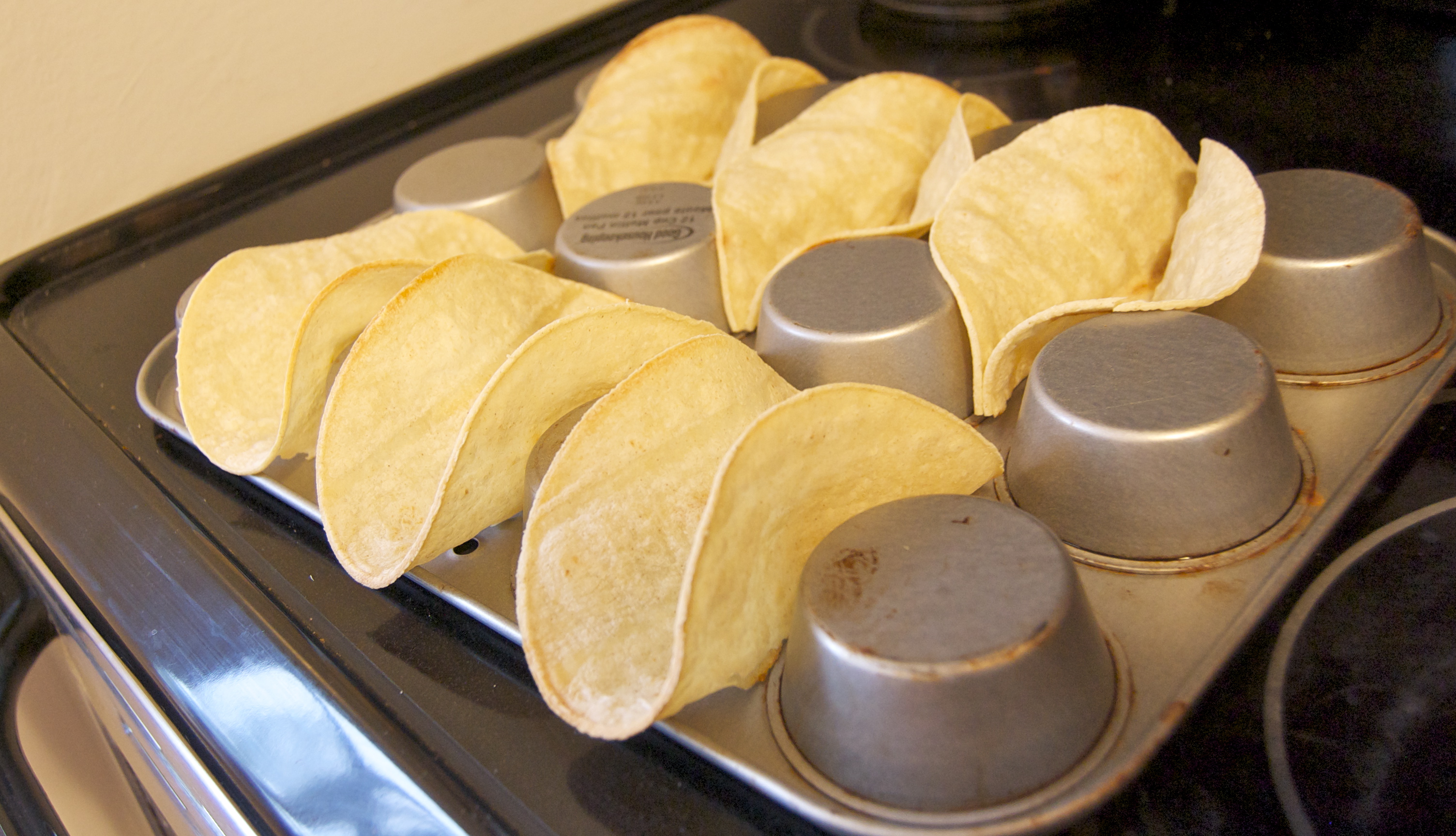 Last night, we were supposed to go to an awesome, *extremely* inspirational food event. But it was postponed until next week due to bad weather. Weather fail. So, in a last-minute rush for dinner, I defrosted some shrimp (we always keep a bag of frozen shrimp on hand), made some brown rice and got creative with some blue corn tortillas we had in the refrigerator that were on the verge of stale. You see, in the course of cruising Pinterest, I’d seen a really clever photo of someone making hard taco shells using an upside-down muffin tin. Here is that photo (provided by the generous Carrie of Plums in the Icebox).