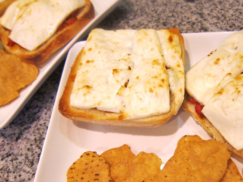 This week, inspired by a recipe in the most recent issue of Food and Wine magazine, we made a roasted red pepper relish with olive oil, basil, garlic and smoked paprika, spread it on a Ciabatta roll, topped it with goat’s milk feta and crisped and melted in the toaster oven. We served it alongside crunchy sweet potato chips. It was fast, filling, fabulously tasty and totally free of meat. Win.