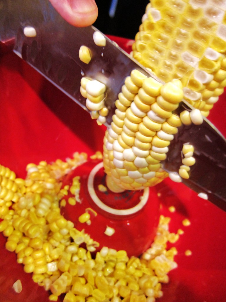 Take the corn off the cob. Here’s a trick: Put a small bowl upside down inside a larger bowl, rest the corn cob on the small bowl and cut carefully down the cob so the kernels fall into the larger bowl.
