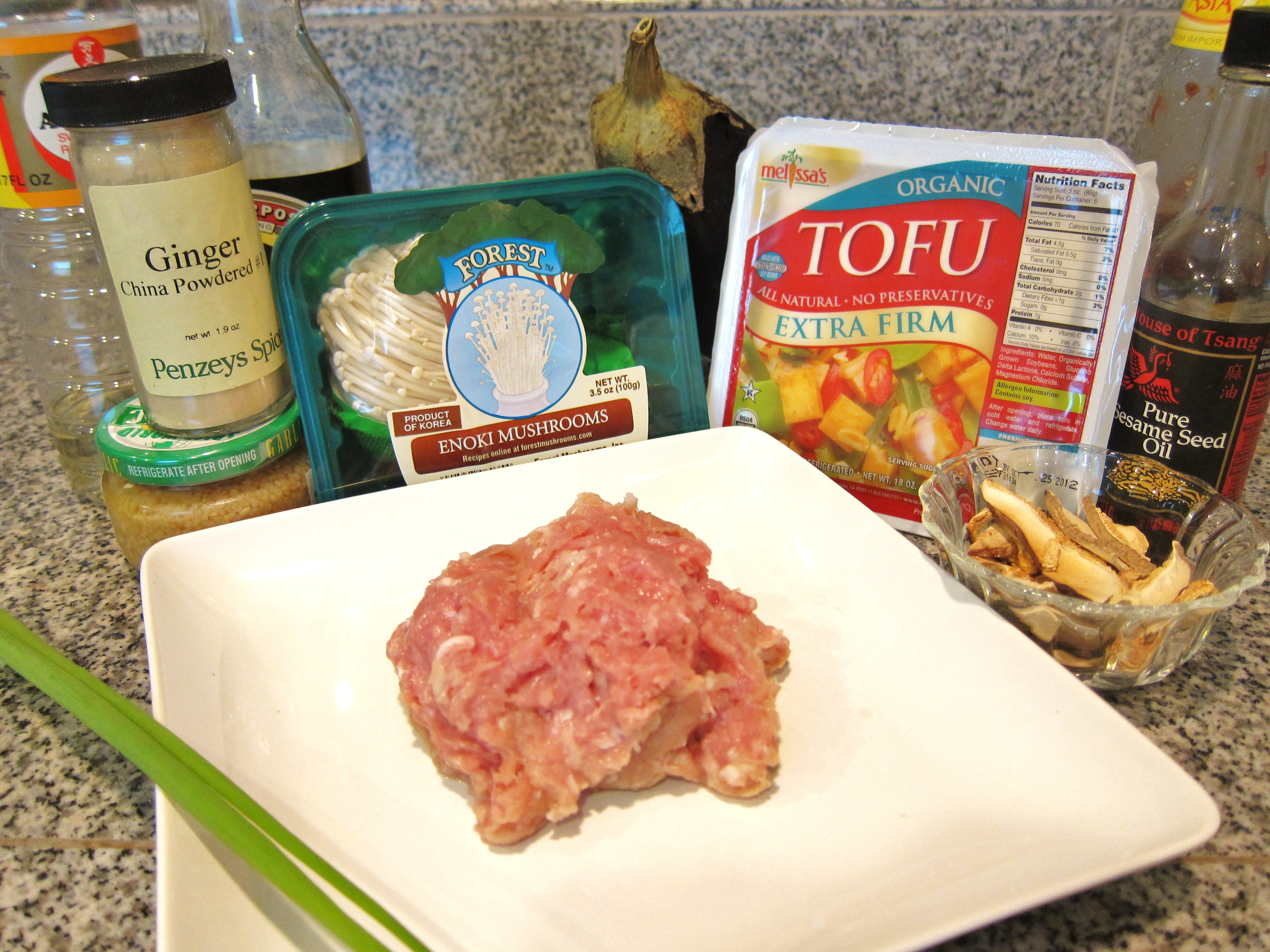 Begin heating your vegetable (or canola or safflower) oil to about 350 degrees. While oil is heating, put a bit of extra virgin olive oil into a saute pan and start cooking your ground chicken (or pork). When about 75 percent cooked through add ginger and garlic. Stir and cook for about one minute. Add mushrooms and onion. Stir and cook for about one minute. Add half of the sauce to the saute pan. Cook for about two more minutes to let sauce thicken. Turn off heat, but leave in pan.