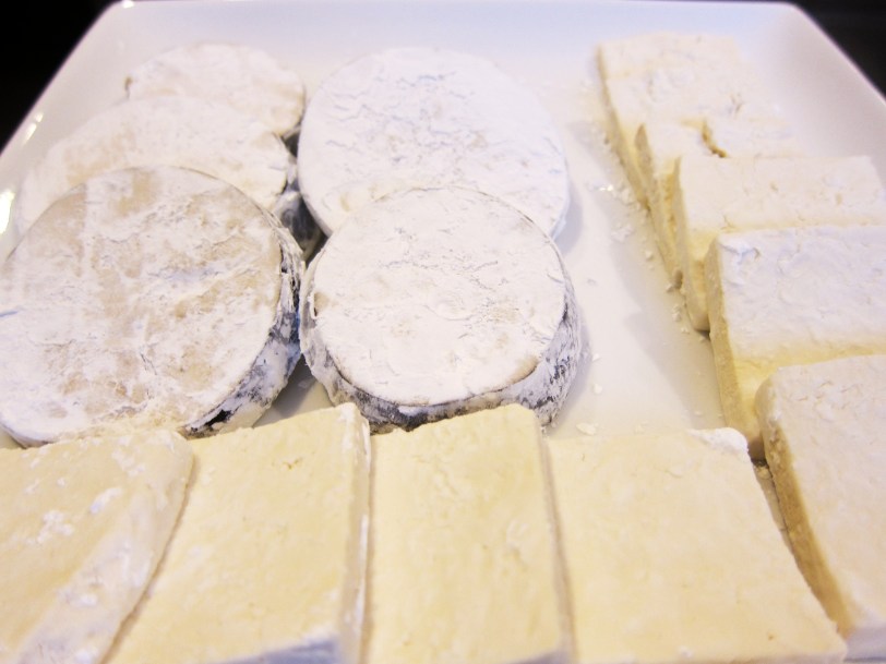 Slice your eggplant and tofu about 1/2-inch thick. Gently press the tofu between paper towels to remove some of the moisture. Dredge in corn starch.