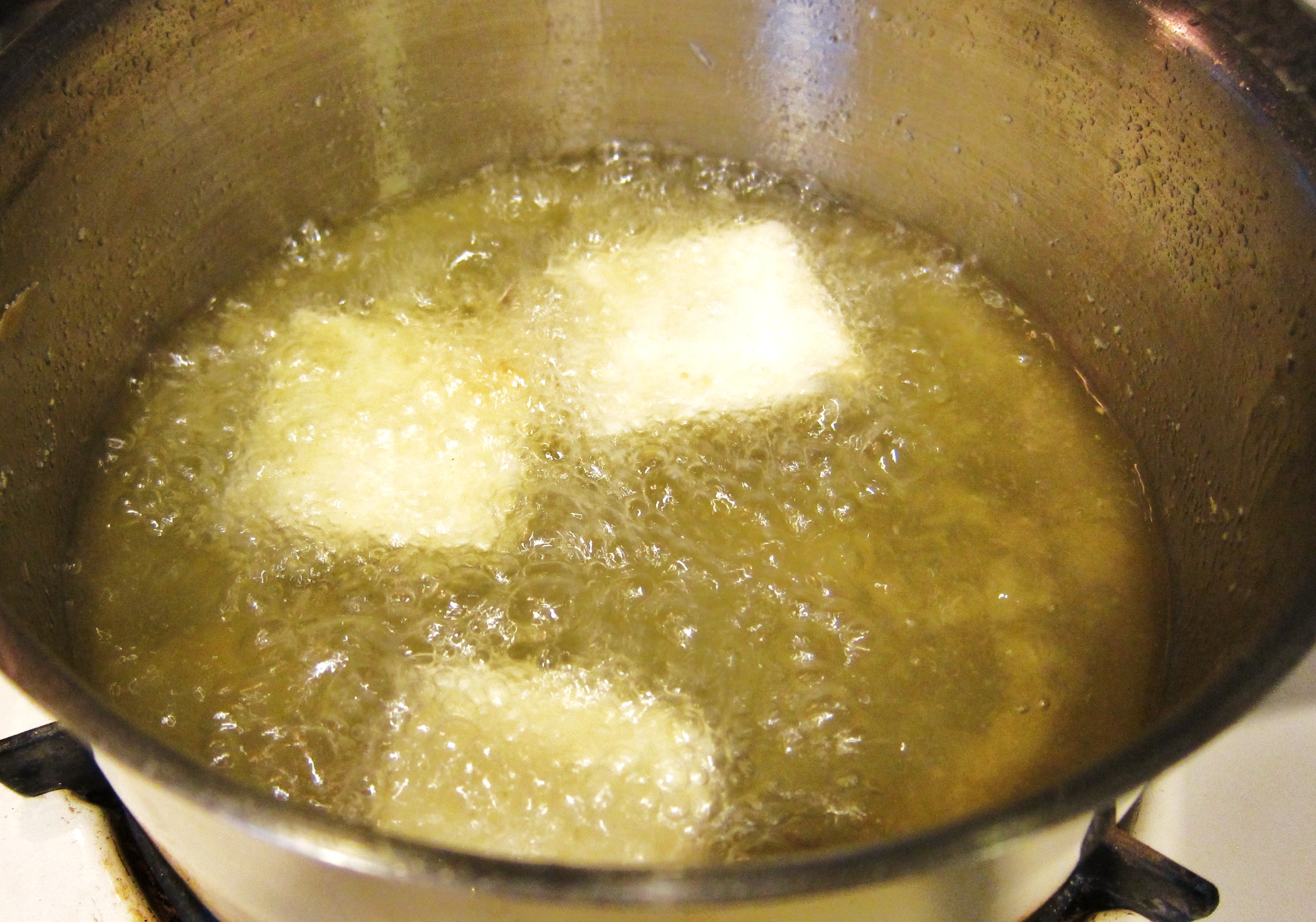 When your oil is up to temperature, drop the tofu in. Don’t put too many pieces in at a time or they’ll be overcrowded and the oil temperature will drop.