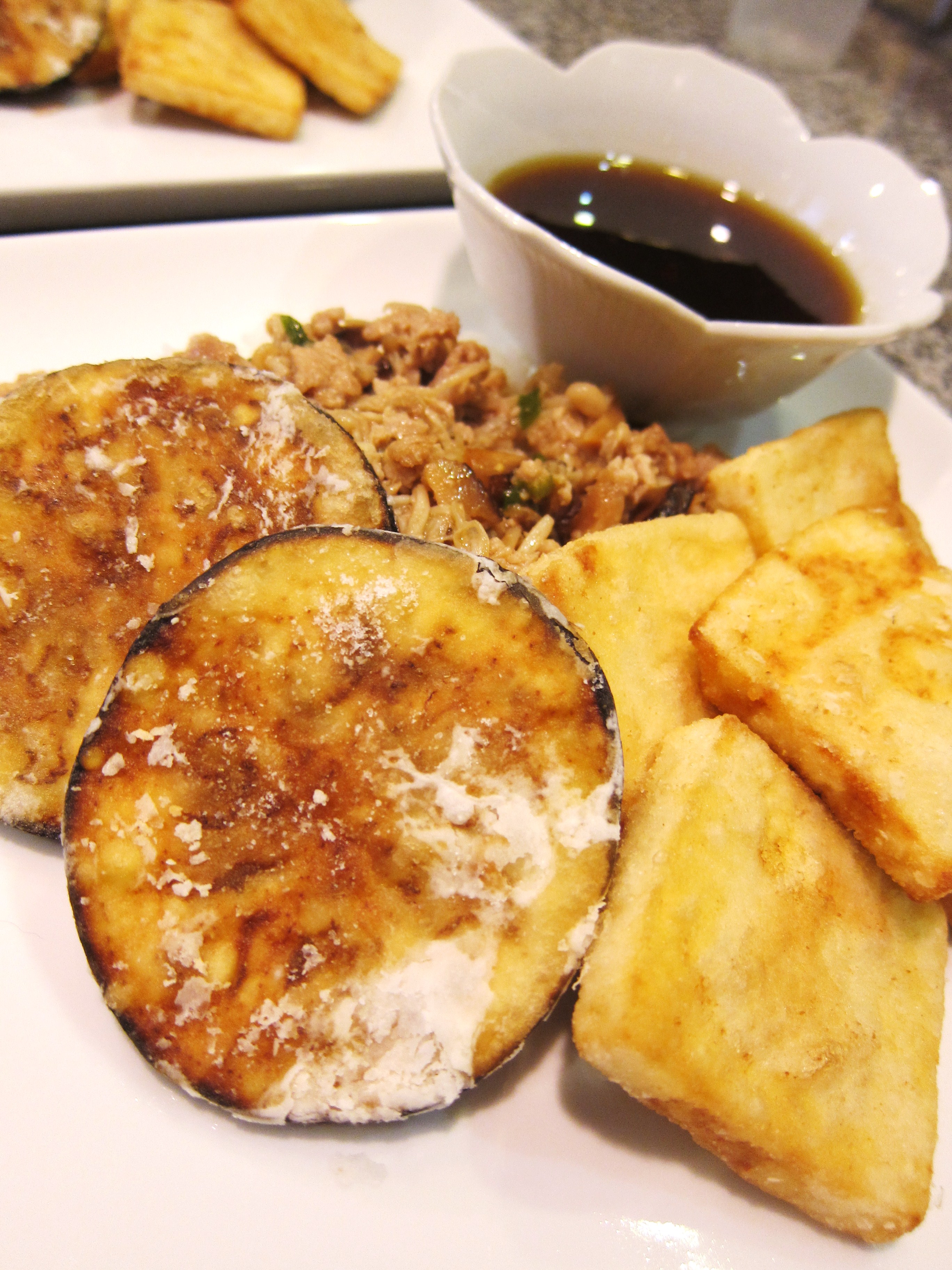 When it’s golden brown, remove tofu with a slotted spoon and drain on paper towels. Salt the hot tofu. Working quickly, fry the eggplant. When it’s golden brown, remove tofu with slotted spoon and drain on paper towels. Salt the hot eggplant. During the last batch of eggplant, put the meat back on low heat to make sure it’s warm.