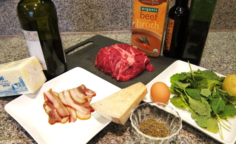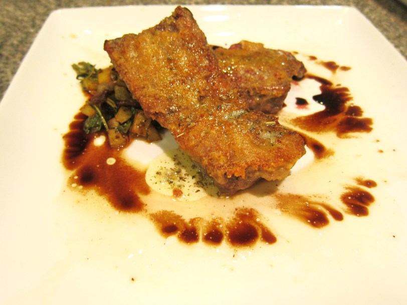 So, can you go wrong with meat covered in crispy cheese? No, no you cannot go wrong with this. The beef was perfectly cooked and the crust unctuous, salty and crunchy. The sweet, herby butter was nicely rich and the balsamic syrup cut through all the decadence. The greens were bitter, but it was offset by the deep saltiness of the bacon and the tart vinegar. Lovely. Note: We reduced the beef stock and also drizzled that on the plate, but it turned out to be completely unnecessary.