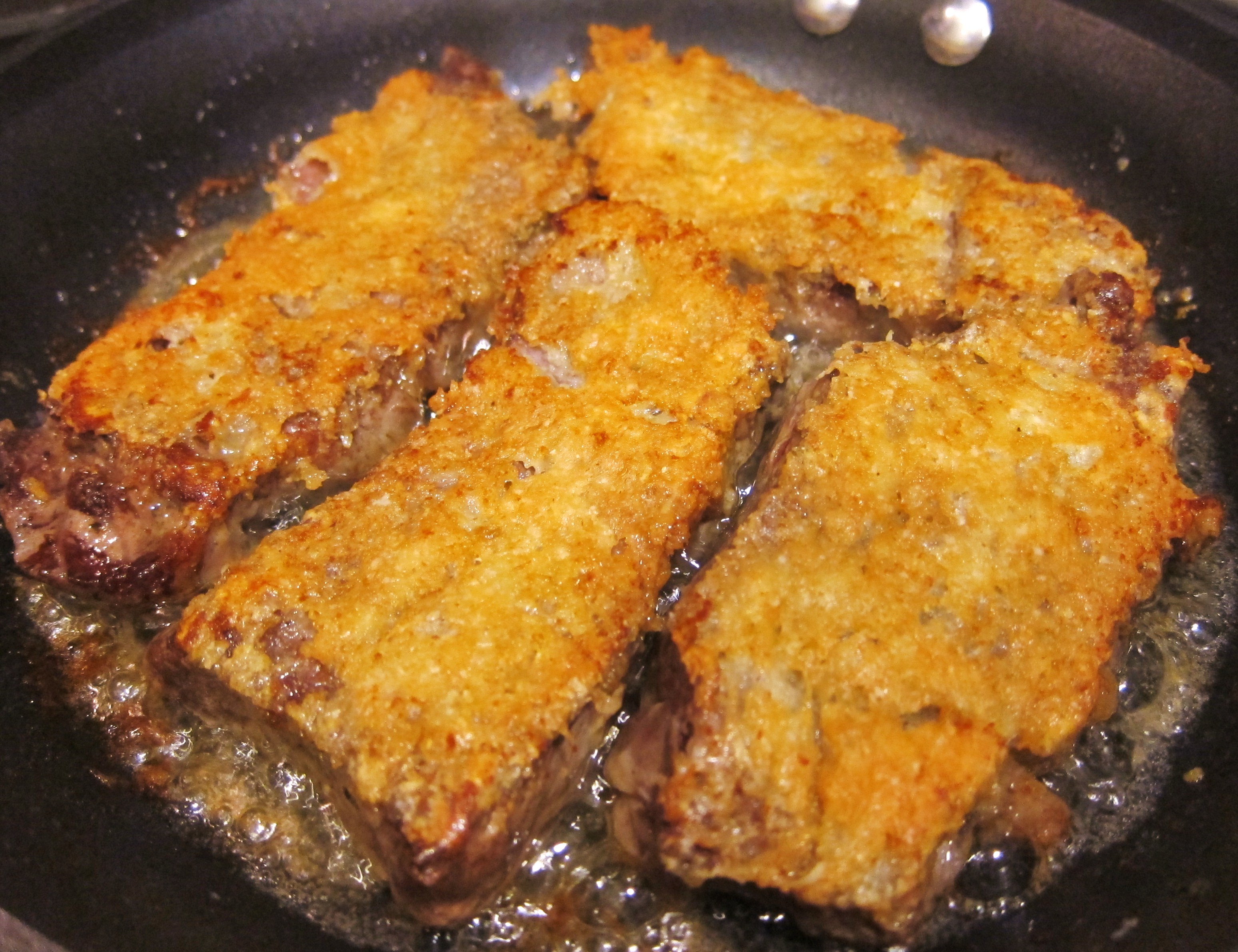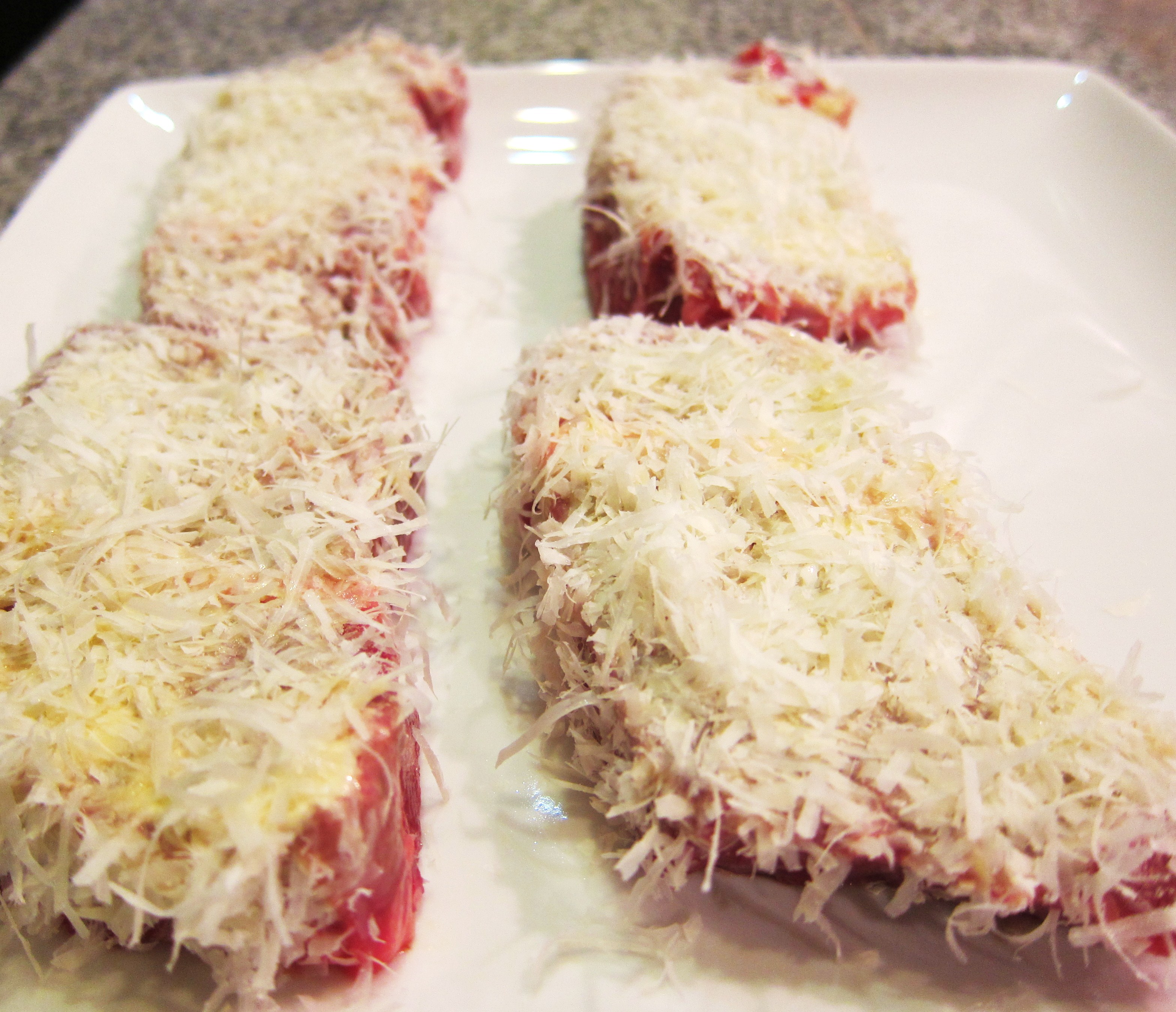 If you’re following this season of Top Chef Masters, this is for you (if you’re not, feel free to skip to the food): SPOILER ALERT :: We’re so sad Chef Takashi was sent home! Justice was not served when such a talented chef was bounced while the Taco Bell chef stayed. Boo. That said, we’ve been surprised by the quiet sneak-up by chef Kerry Heffernan. He wasn’t originally on our radar, but he’s been rockin’ it lately. Case in point? His Quickfire winning dish of Parmesan-crusted beef filet with wilted greens (click here for original recipe). Can you go wrong with meat crusted in crispy cheese?!? Here’s how we made the recipe home cook-friendly to find out.