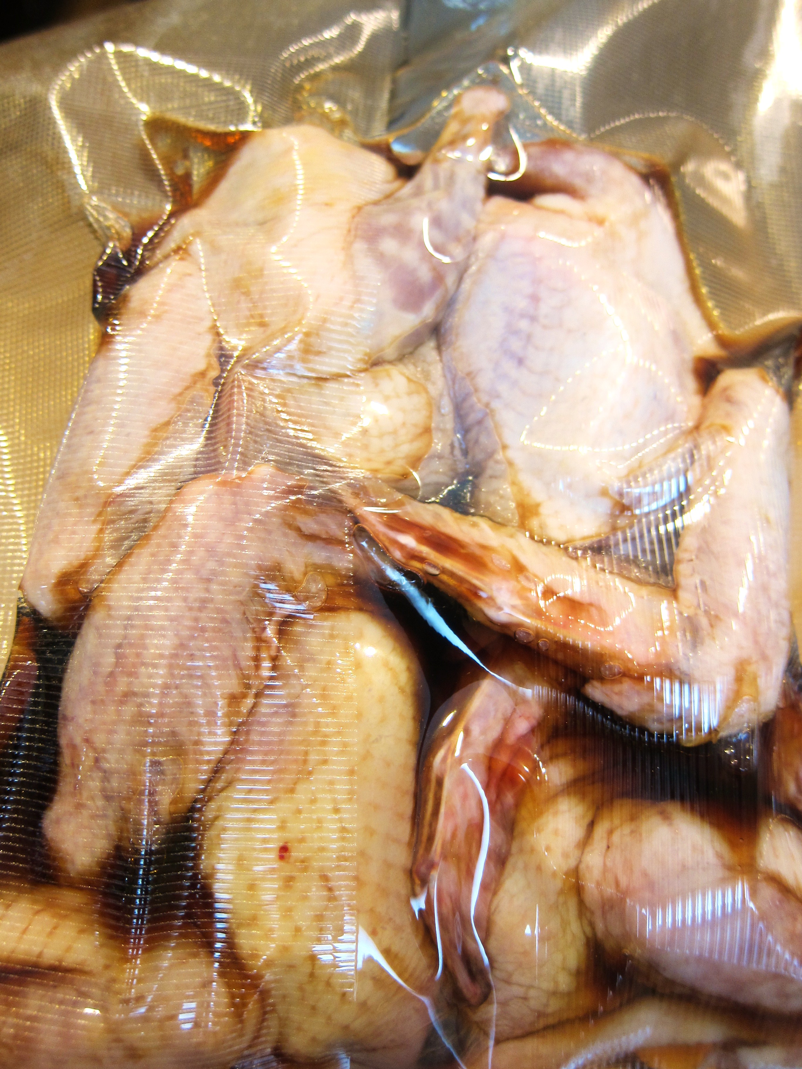 Heat the sous vide machine to 148 degrees F. Load the squab into a sous vide bag and add the marinade.