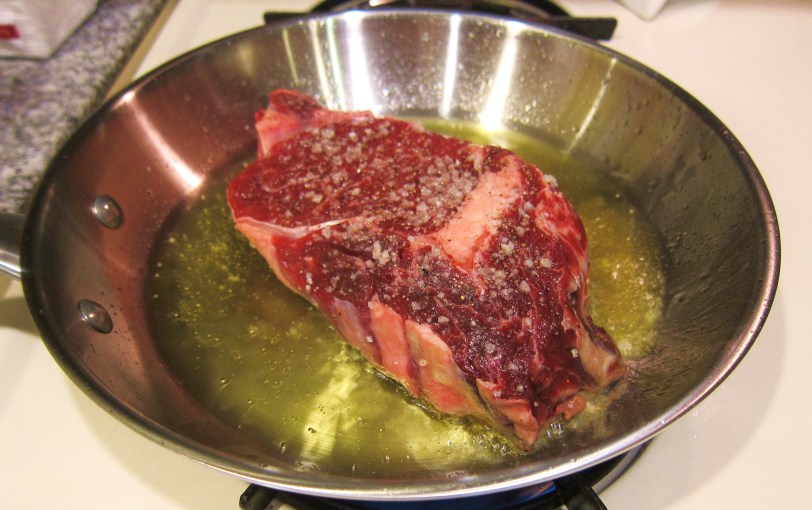 Heat about 1 TB extra virgin olive oil over med-high heat. We used our BlueStar 10″ fry/saute pan for this. Whatever you use, make sure the pan is oven-safe (no plastic, etc). When oil is very hot, sear steak briefly on both sides (about 2 minutes per side).