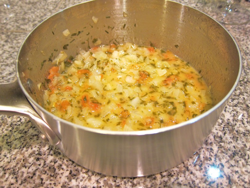 Put white wine vinegar, sugar and 1/2 cup water in a sauce pan over medium heat. As soon as sugar disappears, add diced fennel and shallot. Reduce the liquid almost completely. Whisk in the butter until it’s incorporated and the sauce is creamy. Add tomato, chives, parsley, fennel fronds and salt (to taste). Keep the sauce warm.