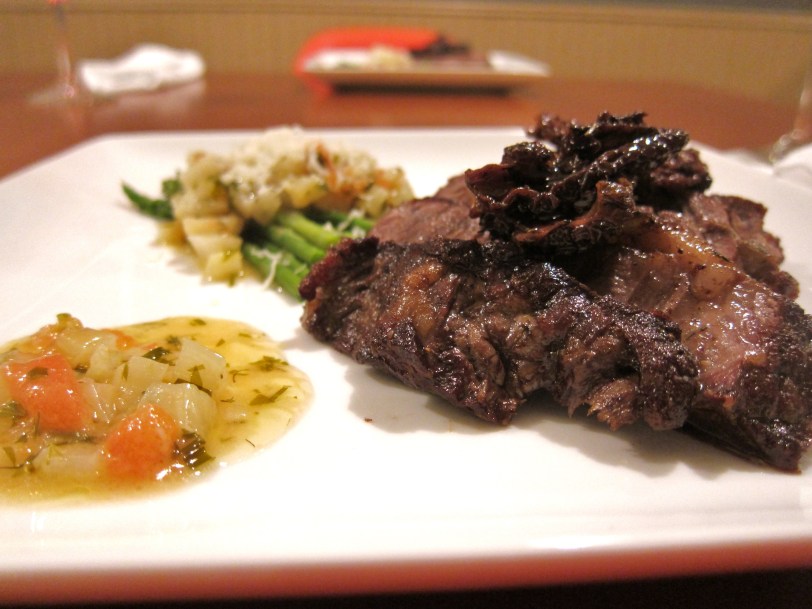 We managed to catch the first episode of season 10 before we left town and some of the new contestants are doozies. They do, however, seem supremely talented and for one of their first challenges they were to make Wolfgang Puck the perfect omelet. I love omelets. K hates eggs. This posed a challenge in deciding what to make. So we compromised — instead of Eliza Gavin’s New York strip and morel mushroom omelet with fennel tomato reduction (original recipe here) we made a grass-fed rib-eye steak with morels and tomato fennel reduction.