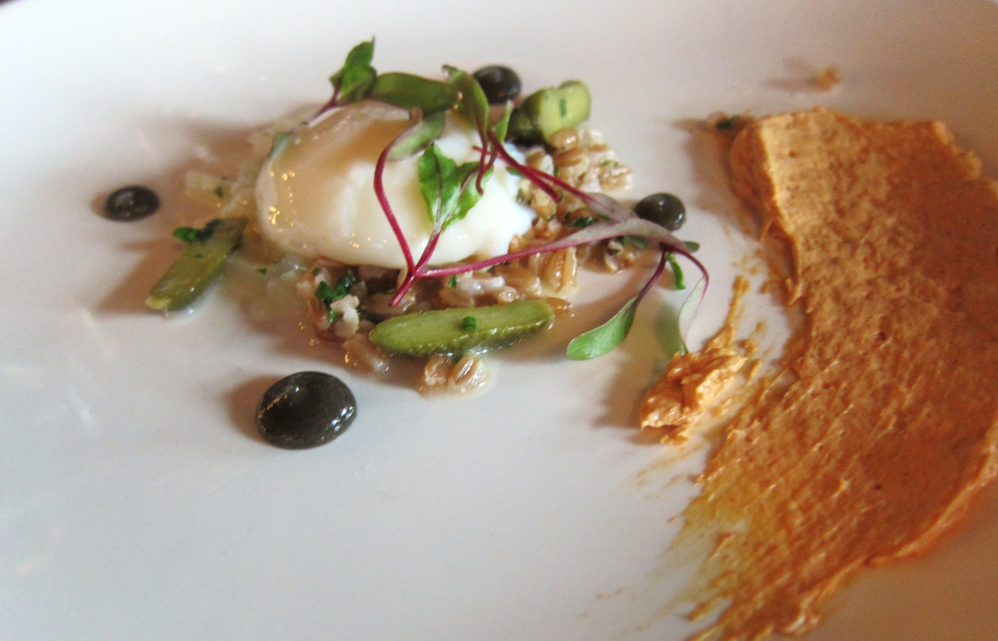 victory 44 eggA 62 degree egg over farro with chorizo “paint.” The farro was perfectly chewy and while the egg was a little too runny for my taste, it blended beautifully with the spicy chorizo sauce and the piquant cornichon pickles.