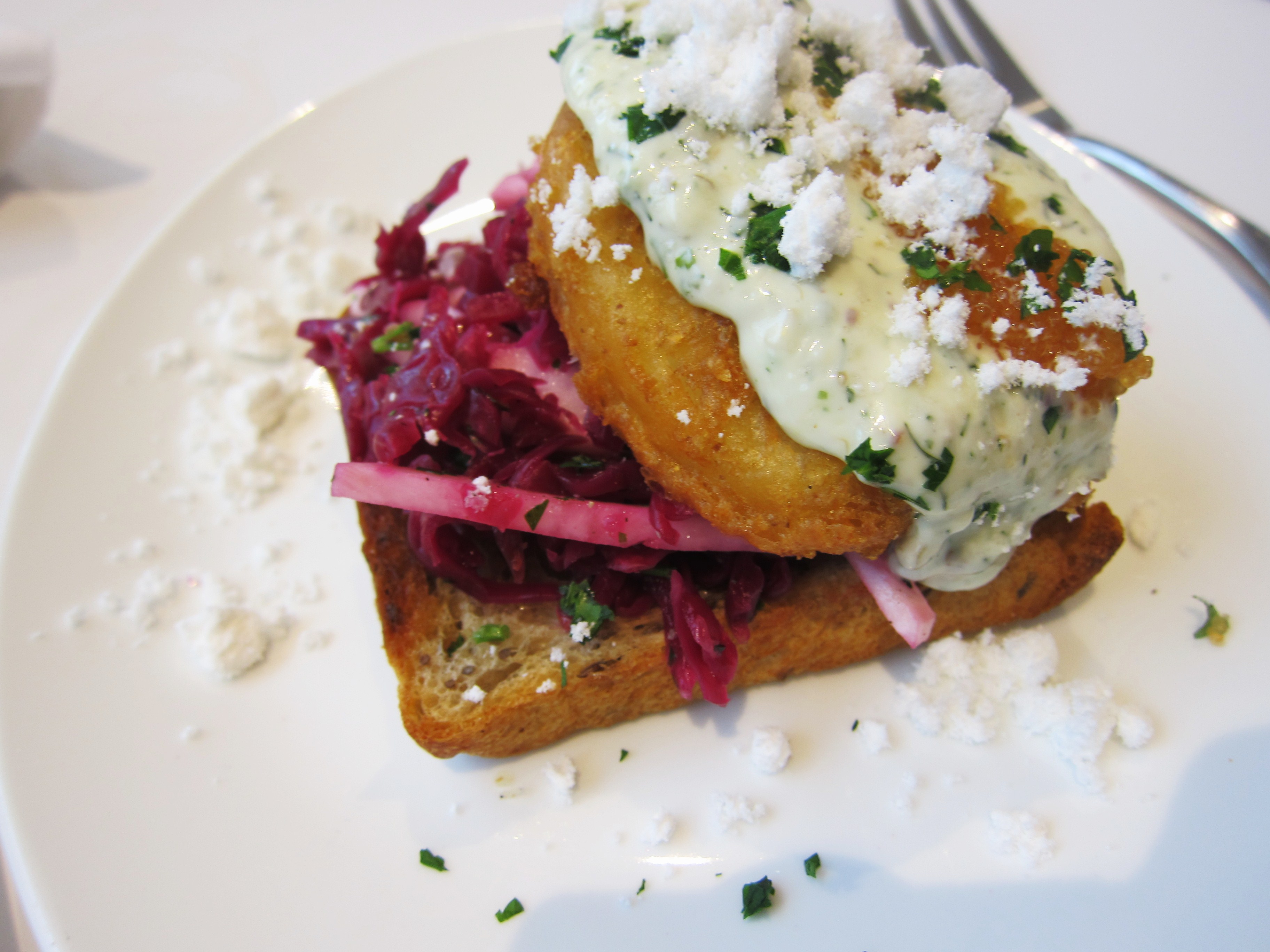 One of our recent visits included this savory sandwich (smorgas). Crispy, beer battered cod on top of tangy turnip slaw, remoulade and horseradish on rye toast. It’s deceptively simple with a beautiful balance of hot, cold, crunchy and creamy.