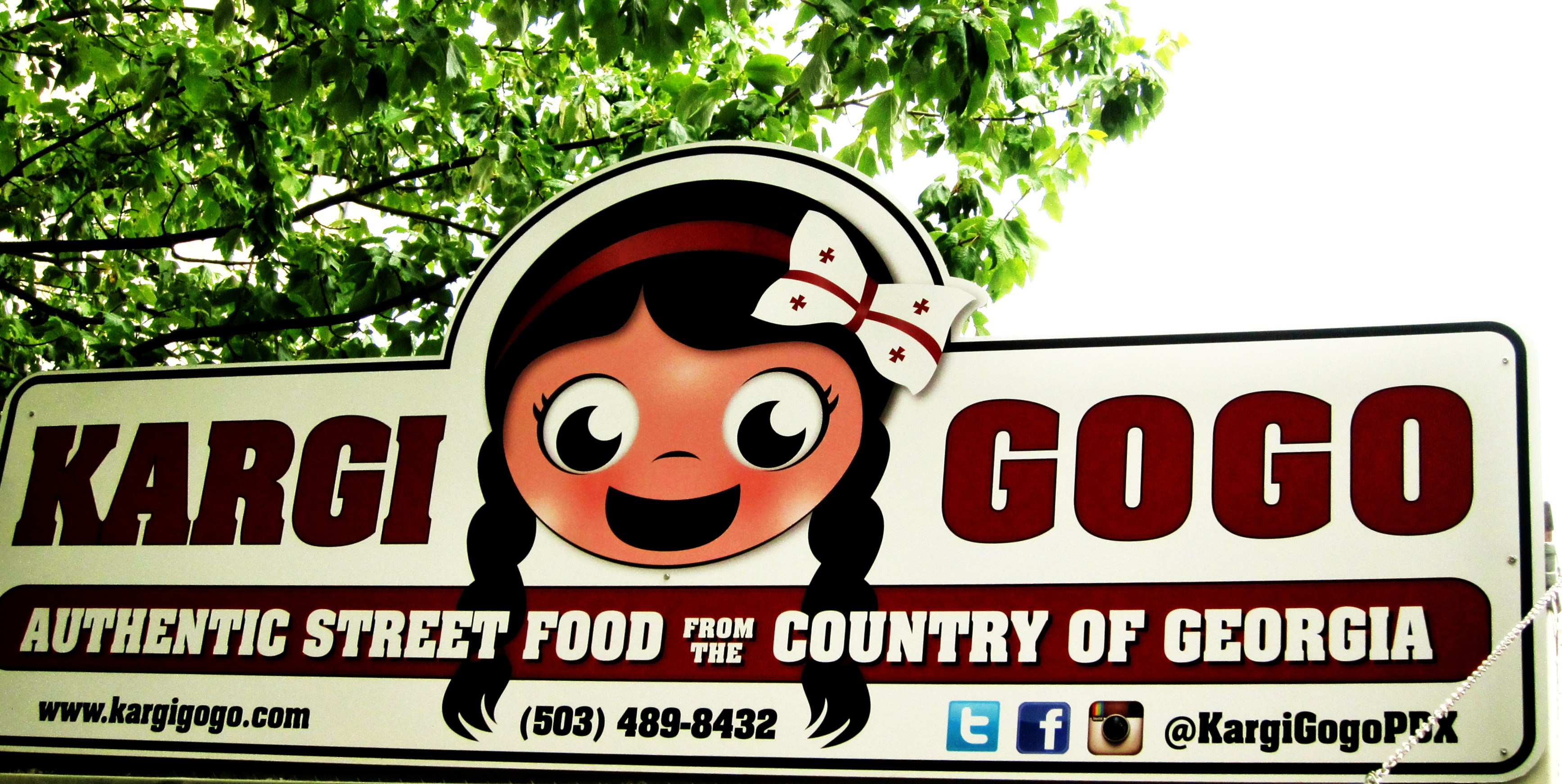 On day two of our Portland adventure, I was rarin’ to go … after I slapped on a bunch of SPF 55+ sunscreen. Turns out, we were staying just one block away from the largest concentration of food carts in Portland. There were more than 40 of them!! We met up with K’s high school friend who lives in Portland and got to work trying to decide what was for lunch. Ultra marathon runner and everywhere biker Scott quickly chose the Cheesus — a burger sandwiched between two grilled cheese sandwich “buns.” Because you can do things like eat a grilled Cheesus when you run and bike constantly. K settled on the porchetta sandwich from The People’s Pig. I lapped the food carts four times thinking, “I need to pick something that I can’t get in Minneapolis/St. Paul.” Given the vibrant food truck scene in MSP, it was tough to choose! Finally, I decided on Kargi Gogo — food from Georgia (the country, not the state).