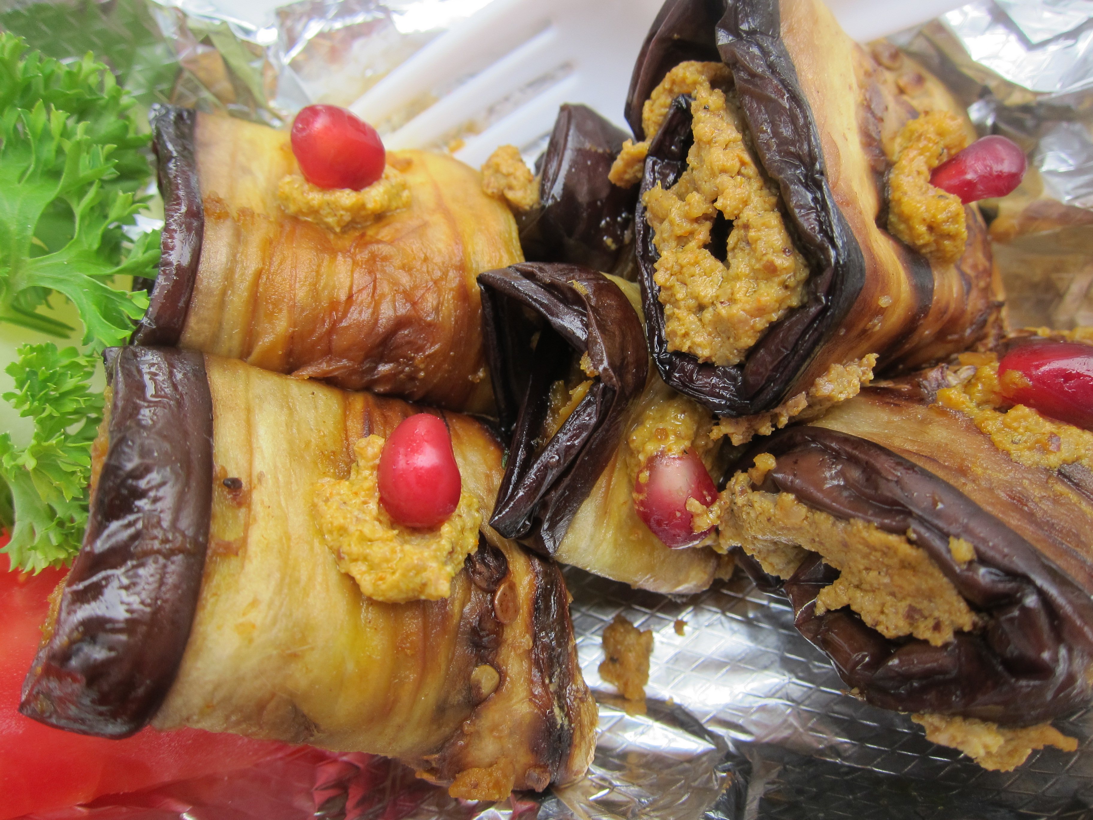 Sandwiched (ha!) between western Asia and eastern Europe, Georgia has an intriguing mix of food. I went with perfectly roasted eggplant rolled around nutty and smooth walnut filling with bright, sunny, sweet-tart pops of pomegranate seeds on top. Delicious!