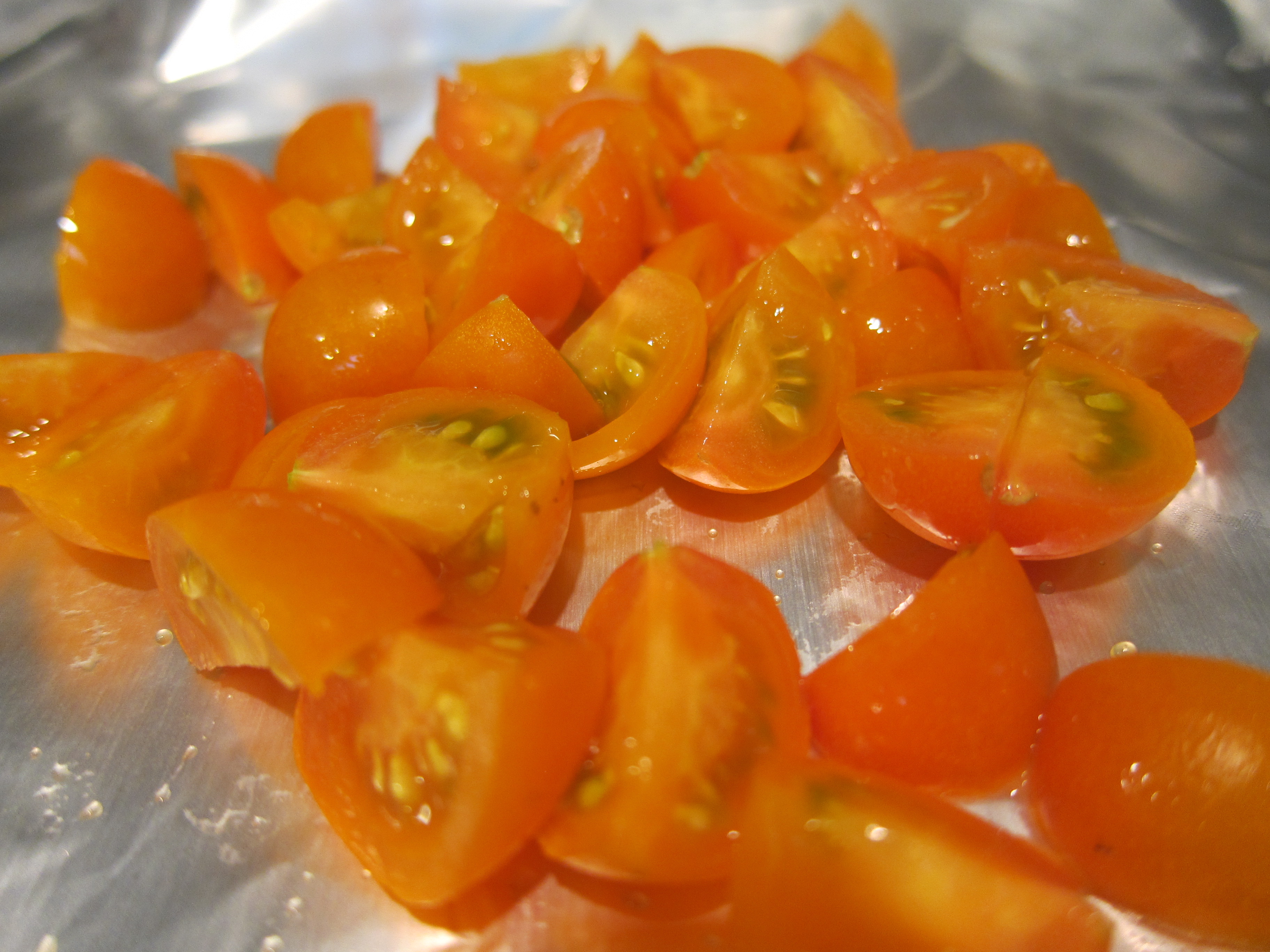 It’s been very hot in Minnesota of late, so we decided to use the grill as our primary heat source. We took farm-fresh cherry tomatoes, drizzled a little olive oil on top and roasted them on the grill for the vinaigrette. Look at these beauties!