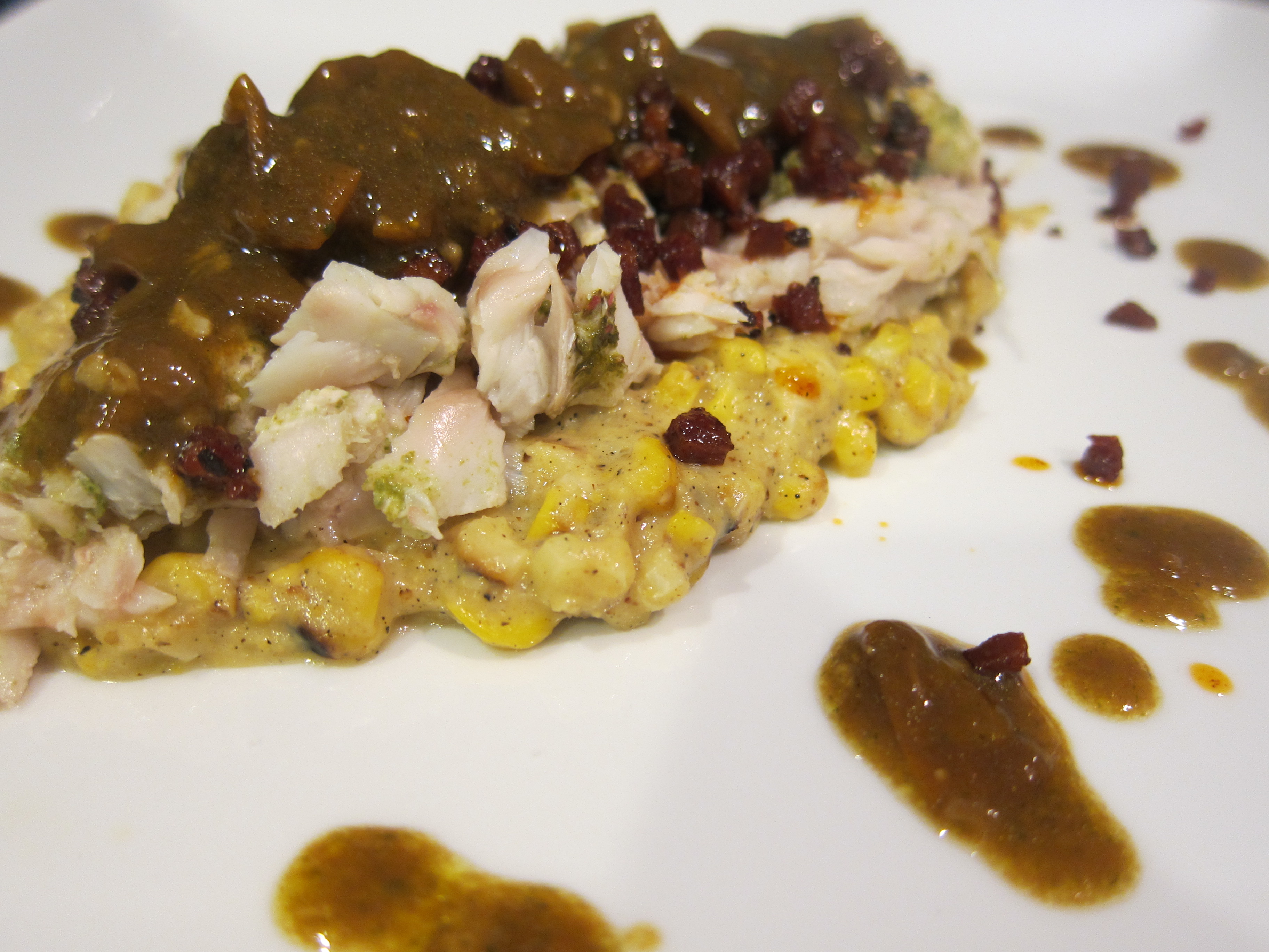 The chefs on Top Chef Masters this season are totally hitting it out of the park, food-wise. The website content team at Bravo are NOT hitting it out of the park this season. They’ve only been posting three or four of 10 to 15 dishes made on the show so we decided to take matters into our own hands, looked at the photo of Chef David Burke’s snapper with sweet corn puree, roasted tomato vinaigrette and garlic chorizo and made our own damn recipe.